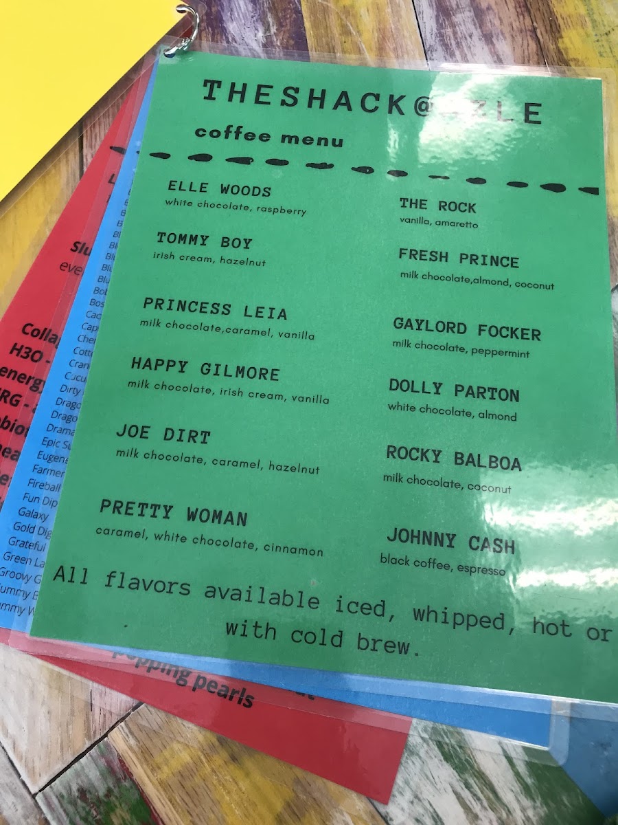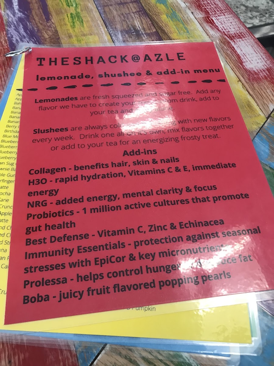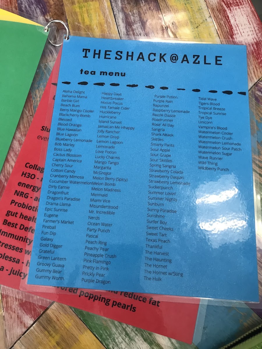 Pick 1 aloe shot, 1 shake, and 1 tea. Choose a tea: raspberry tea, peach tea, chai tea, cinnamon tea, lemon tea. Choose a shake: fruity pebbles shake, apple pie shake, mint chocolate shake, thin mint shake, blueberry muffin shake. Choose an aloe shot: mango aloe shot, cranberry aloe shot, mandarin aloe shot.